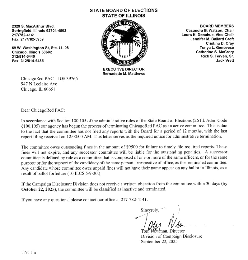On October 16, 2025 the ChicagoRED PAC would file 6 quarterly reports to the Illinois State Board of Election, after receiving notice of a $9,500 fine due to a lack of filing regular quarterly reports with the board in the previous month of September.